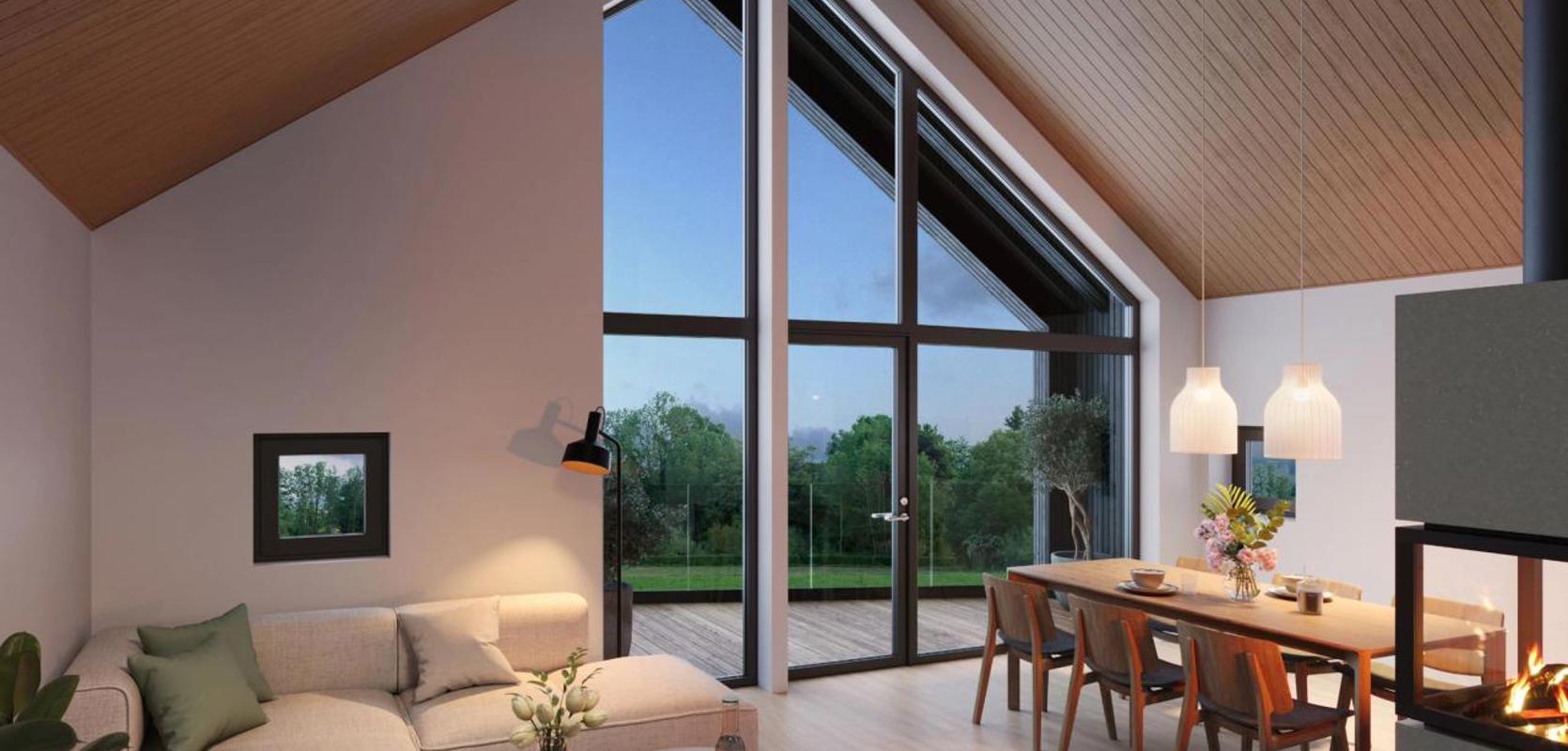 Stue/kjøkken er et godt rom med god takhøyde og perfekt for tomt med utsikt.