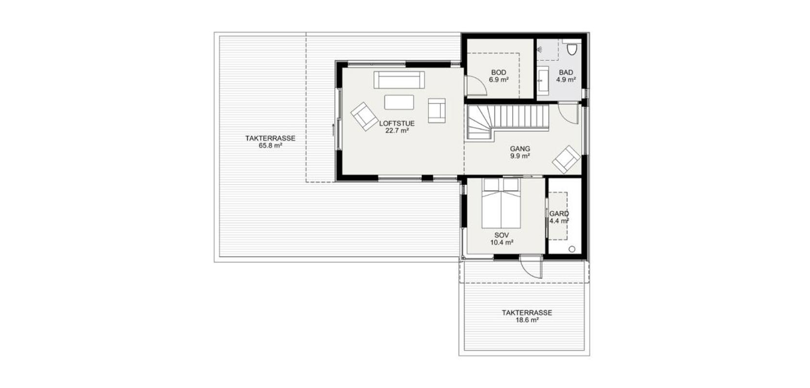 Toppetasjen har to takterrasser. En privat, med adkomst fra et større soverom. Dette drømmesoverommet har både privat uteplass og en romslig gå-inn-garderobe. I tillegg er det en stor terrasse på hele 65 kvadratmeter, med utgang fra loftstuen. Felles for begge terrasser er at taket stikker en god del ut over fasaden slik at man har mulighet å sette ting som puter og gjenstander under hvis regnet kommer. Etasjen inneholder også et bad.