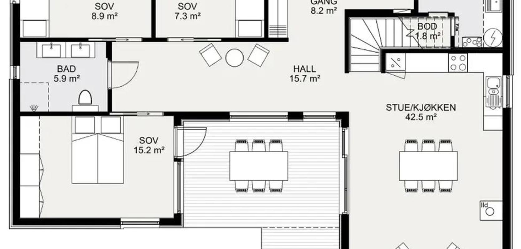 Lyngen er et moderne og tidløst hus med et hjerte plassert sentralt i husets kjerne, nemlig et atrium. Atriet er et fantastisk inne-ute rom som er overdekket og gir ly for vær og vind. Et perfekt rom å nyte lange sommerdager sammen med familie og venner.