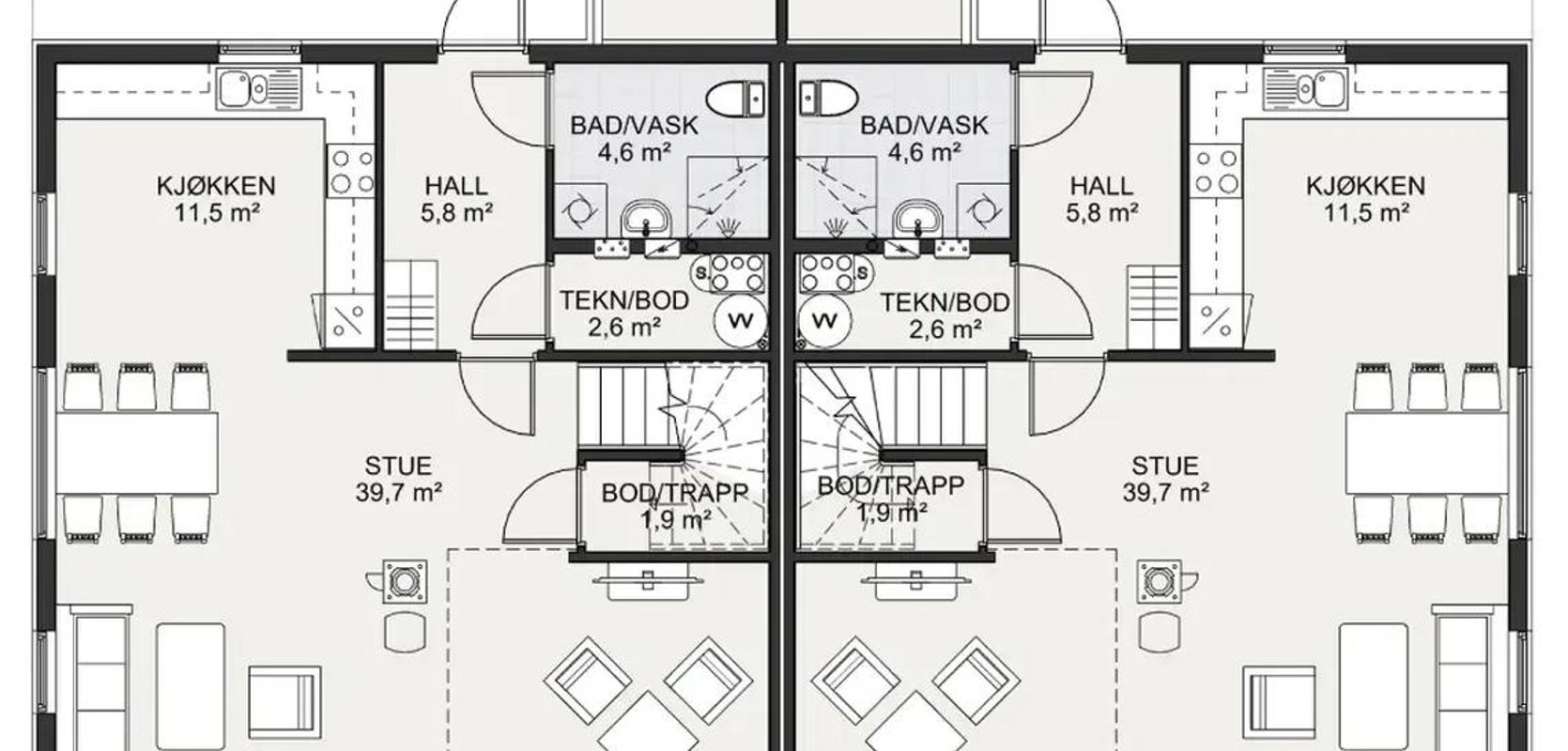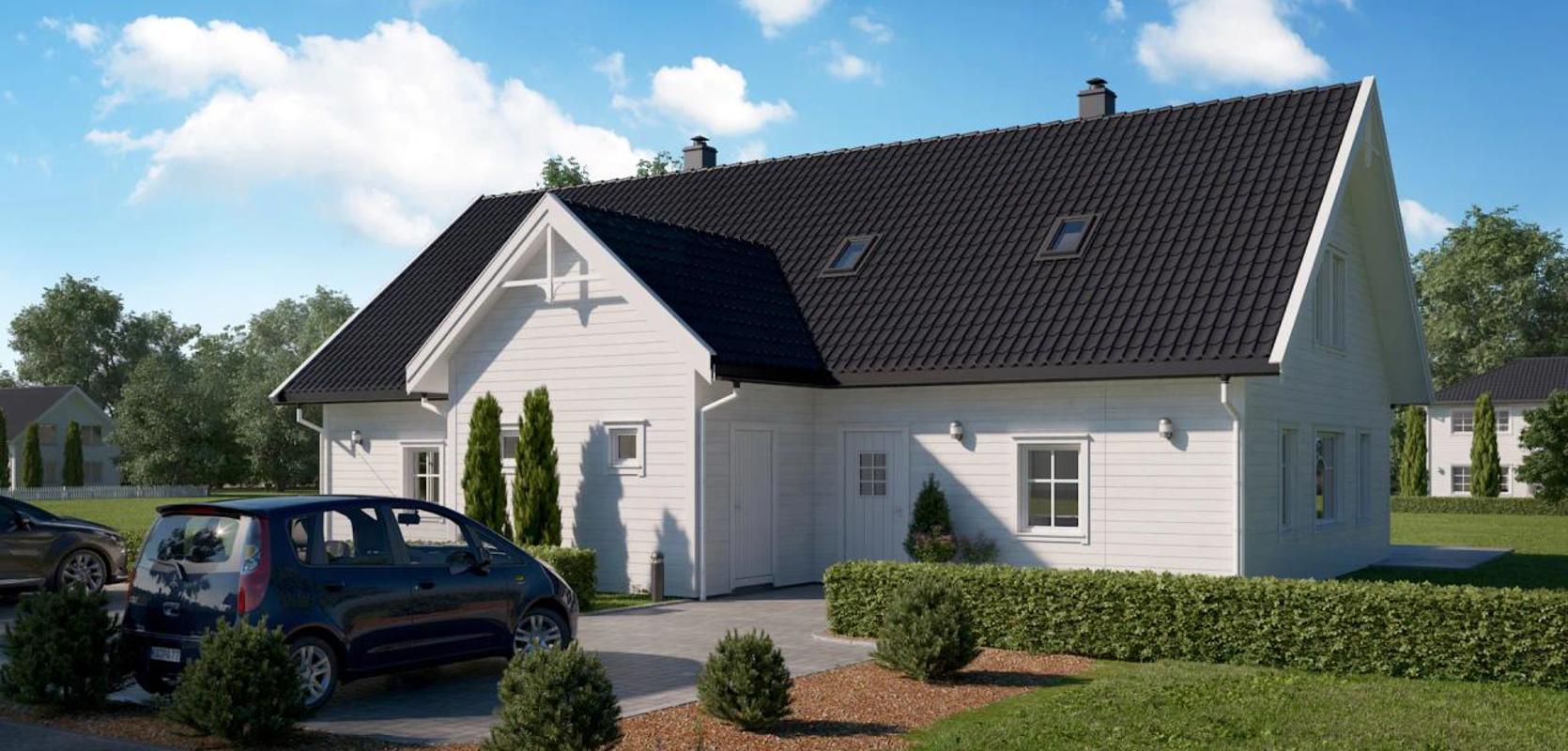 Mesterhus Norhild en tomannsbolig med en praktisk og smart planløsning. Denne vertikaldelte boligen tilbyr et funksjonelt og romslig boareal på 127 m² pr boenhet.