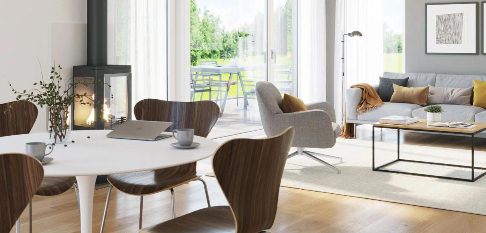 Skansen har et praktisk overbygd inngangsparti, med sportsbod rett utenfor hoveddøren. Dett gjør det lett å sette fra seg barnevogn eller andre ting som ikke trenger være med inn i huset. Rett innenfor døren er det også en bod. Videre kommer du inn til en romslig stue med utgang til terrasse. Det er plass til peis midt mellom spisestuen og stuen, slik at man kan få glede av den uansett hvor man sitter. Huset har et romslig L-formet kjøkken, med mulighet til å bygge på en bar-løsning. Etasjen har også et stort soverom og et bad.